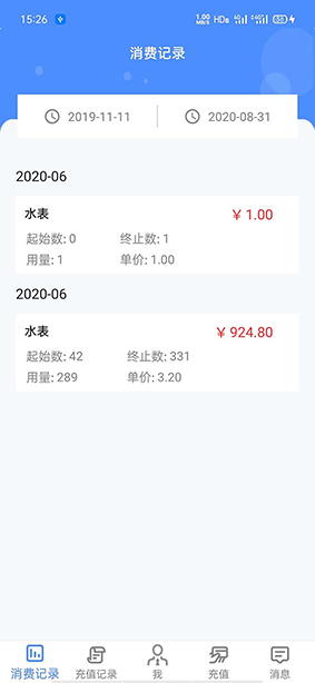 消息記錄是指用戶儀表結(jié)算的詳細(xì)信息,主要顯示每次的用量、單價(jià)、費(fèi)用,用戶可清晰查詢出來,表的用量費(fèi)用情況,界面如下: