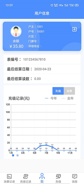 如上圖所示,該頁面展示了用戶的詳細(xì)信息、可用余額和表的相關(guān)信息,頁面右上角有安全退出的按鈕,點(diǎn)擊即可返回至登錄頁面。頁面的中下部分用折線圖來展示用戶當(dāng)前年和去年的充值記錄和消費(fèi)記錄。