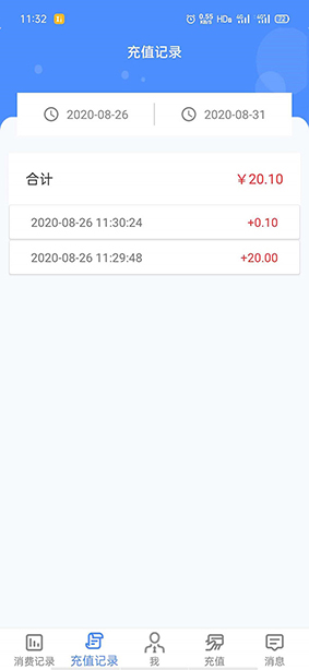 界面顯示所有當(dāng)前時(shí)間段內(nèi)充值記錄(即左側(cè)開始時(shí)間至右側(cè)結(jié)束時(shí)間,用戶可手動(dòng)選擇時(shí)間),包括支付寶與微信支付的繳費(fèi)記錄,都會(huì)在此界面顯示出來,用戶可根據(jù)時(shí)間查詢,來查詢自己的繳費(fèi)記錄。